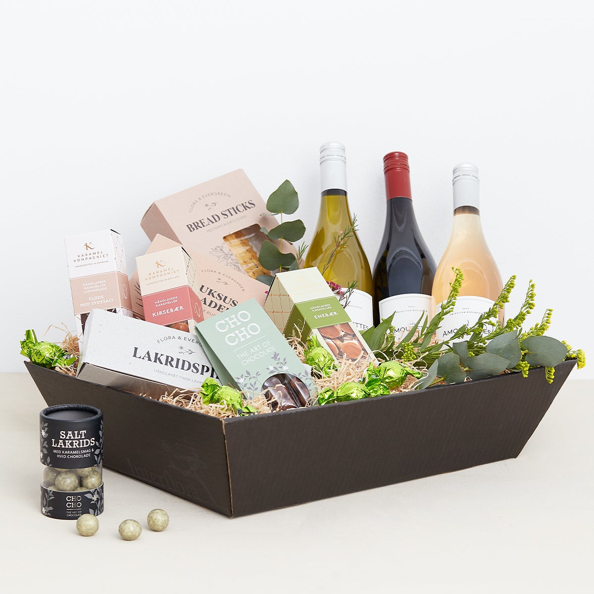 En helt særlig gavehilsen hvor der ikke er sparet på noget! Glæd modtageren med tre flotte flasker vin i rød, hvid og rosé samt de lækreste søde og salte delikatesser.
